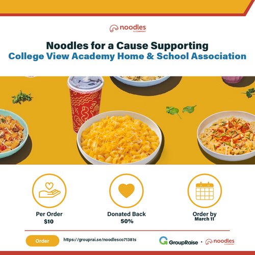 College View Academy Home & School Association is thrilled to announce our latest fundraiser “Noodles for a Cause” with Noodles & Co. No need to try to make it to the restaurant on a specific night that doesn't work for you - purchase codes by March 11 at grouprai.se/noodlesco71381s and use whenever you want! Featuring an irresistible selection of noodle dishes, for just $10 you get a Noodles Bowl and 50% of your order comes right back to support our school! It's a win-win! From comforting mac and cheese to savory stir-fried noodles, no matter if you prefer classic favorites or crave exciting new flavors, the menu has something to satisfy every palate Join College View Academy Home & School Association in this flavor-packed fundraiser! Your participation means the world to us. Visit our unique fundraiser page to order: grouprai.se/noodlesco71381s.