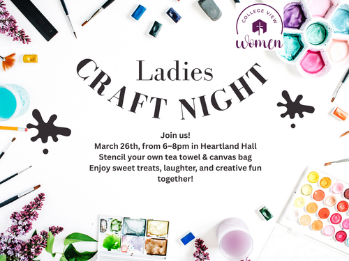 WOMEN'S MINISTRY: Announcing Ladies' Craft Night on Thursday, March 26! Join us at 6pm in Heartland Hall to stencil your own tea towel & canvas bag — plus enjoy sweet treats, laughter, and creative fun together! See the link here to register.
