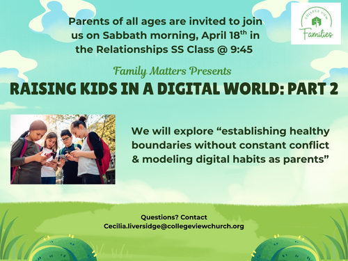 FAMILY MINISTRIES: Raising Kids in a Digital World - Join us Sabbath, April 18 at 9:45am in the Relationships Sabbath School Classroom for an insightful and practical seminar with Pastor David Kabanje. This session will focus on Healthy Boundaries without Constant Conflict and Modeling Digital Habits as Parents—offering encouragement and tools to help you lead your family with wisdom and grace in today’s digital age. Come be equipped, encouraged, and connected with other parents on this journey. For more information contact cecilia.liversidge@collegeviewchurch.org.